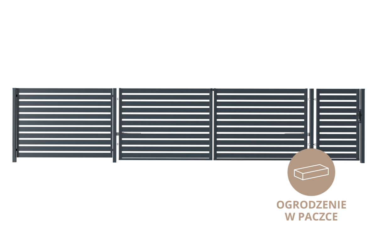 The Szafir Element gate is a modern minimalist model that will fit into any property. It is constructed from 11 horizontal bars 100 x 20 mm. Evenly distributed planks give the effect of harmony and symmetry. A small space is maintained between the bars. The gateway is made up of two wings that are in perfect contact with each other. We can attach it to metal posts, then in the light of posts we need 404 cm. If you are mounting the wall, remember to dock the proper mounts to the hinge and keep 408 cm wide in the light between the masonry posts. If we want to use metal bars, we need to order them separately (they are available in the related products below).