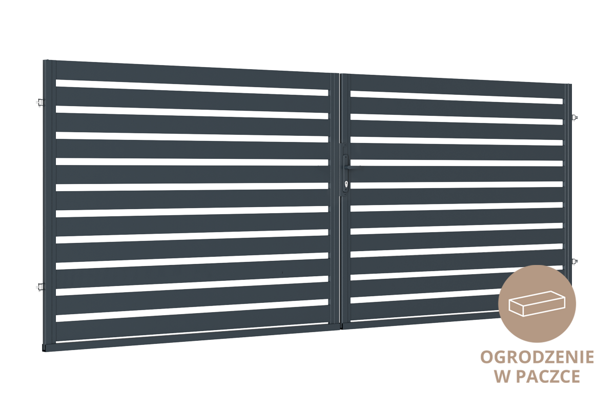 The Szafir Element gate is a modern minimalist model that will fit into any property. It is constructed from 11 horizontal bars 100 x 20 mm. Evenly distributed planks give the effect of harmony and symmetry. A small space is maintained between the bars. The gateway is made up of two wings that are in perfect contact with each other. We can attach it to metal posts, then in the light of posts we need 404 cm. If you are mounting the wall, remember to dock the proper mounts to the hinge and keep 408 cm wide in the light between the masonry posts. If we want to use metal bars, we need to order them separately (they are available in the related products below).